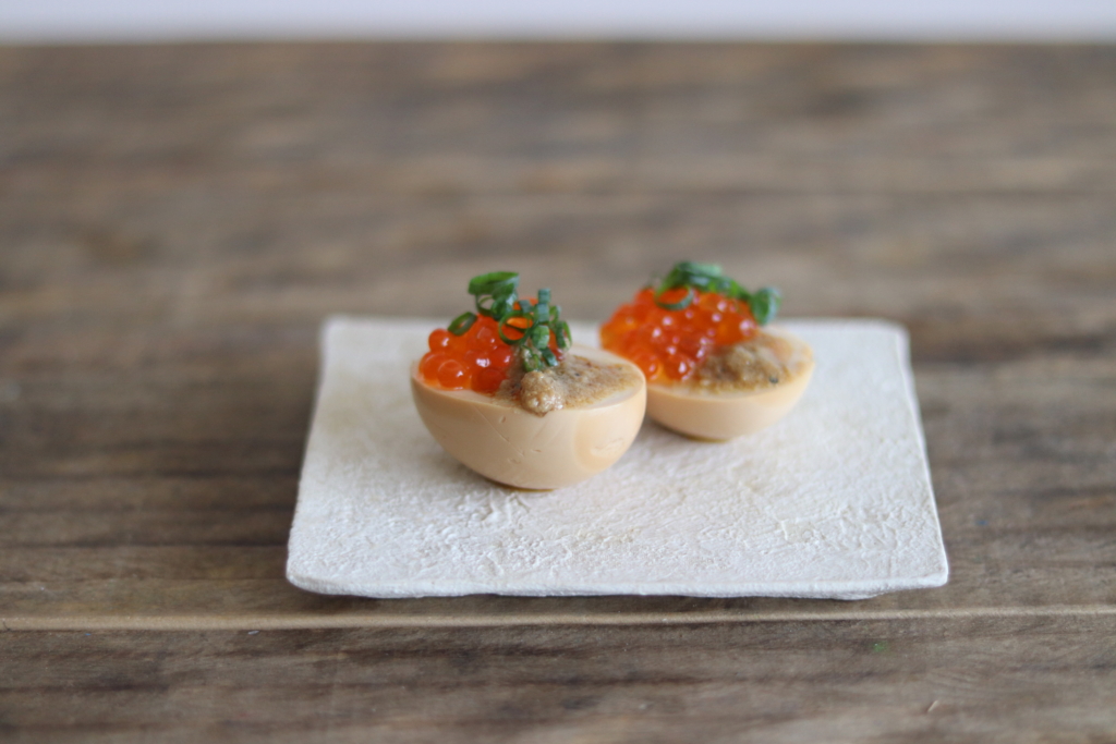 味玉にいくらと薬味を乗せてからすみソースをかけるだけ。豪華に見えるのにサッと作れる、お手軽おつまみが完成です。